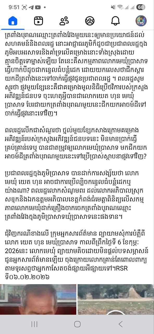 កំណត់ហេតុ របស់មន្ទីវប្បធម៌និងវិចិត្រសិល្បៈខេត្តកំពង់ធំ ស្តីពី ការចុះពិនិត្យ និងកិច្ចប្រជុំដោះស្រាយជុំវិញជីកកកាយត្រពាំងបុរាណមួយកន្លែង ដោយគ្មានការអនុញ្ញាត (ត្រពាំងវែង) ភូមិប្រាសាទ ឃុំប្រាសាទ ស្រុកសន្ទុក ខេត្តកំពង់ធំ ។ បន្ទាប់ពីមានការចុះផ្សាយរបស់គេហទំព័រឈ្មោះ RSR-News ថា​​​​​​​​​​​​​​​ លោក យេត ហុនមេឃុំប្រាសាទ ប្រើអំណាចដាក់គ្រឿងចក្រជីកយកអាច់ដី ដីត្រពាំងបុរាណឈ្មោះត្រពាំងវែង សង្ស័យយកទៅលក់យកលុយដាក់ហោប៉ៅ!។