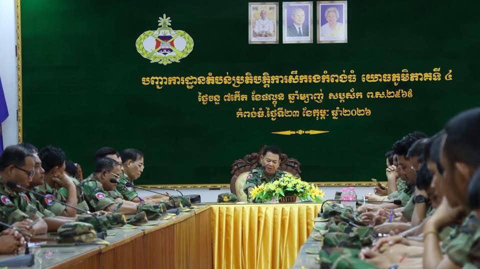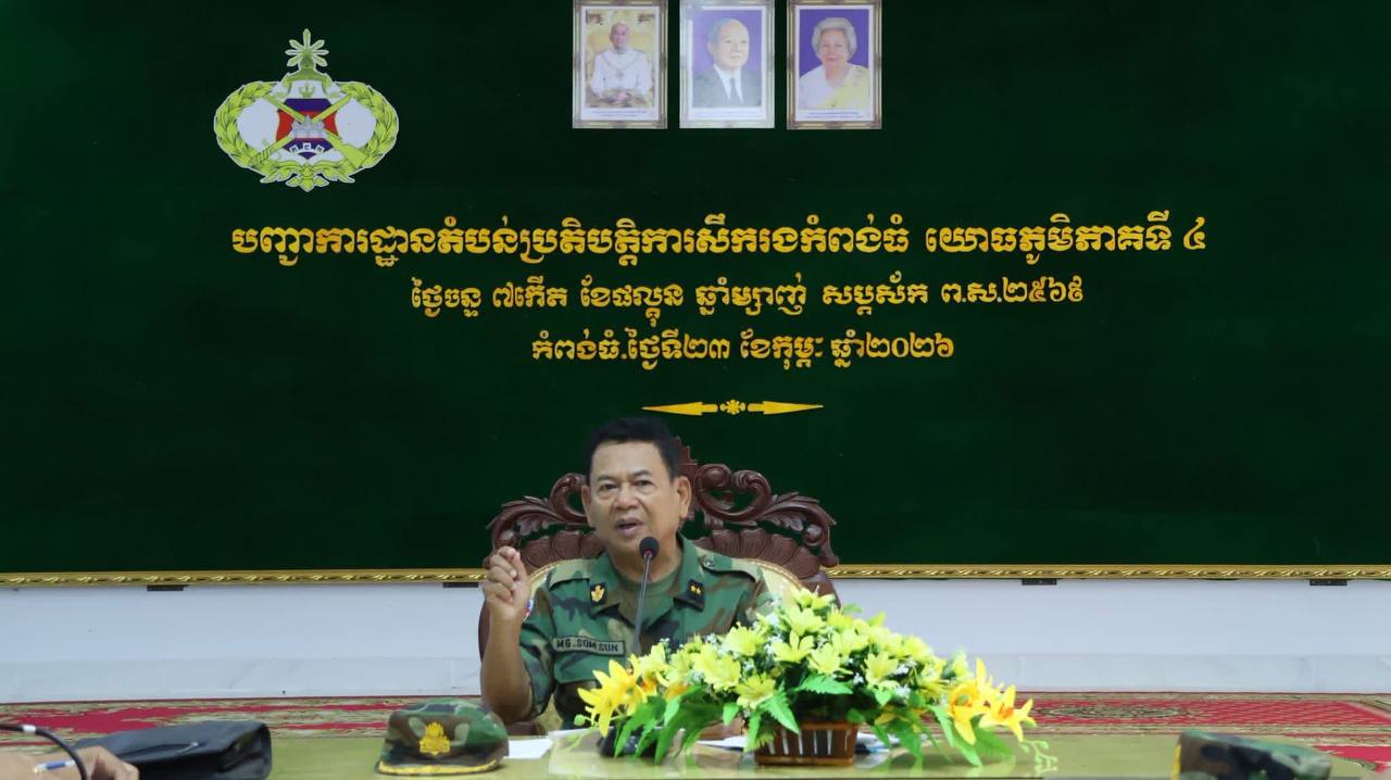 ខេត្តកំពង់ធំ៖ នៅព្រឹកថ្ងៃទី២៣ ខែកុម្ភៈ ឆ្នាំ២០២៦ នៅទីបញ្ជាការតំបន់ប្រតិបត្តិការសឹករងកំពង់ធំ យោធភូមិភាគទី៤ បានបើកកិច្ចប្រជុំផ្សព្វផ្សាយសភាពការណ៍ថ្មីៗ ពង្រឹងតួនាទីភារកិច្ចរបស់កងយោធពលខេមរភូមិន្ទ ក្នុងការការពារបូរណភាពទឹកដី ការពារជាតិ សាសនា ព្រះមហាក្សត្រ  និងពង្រឹងភារកិច្ចការពារ ទប់ស្កាត់ និងបង្ក្រាបទល្មើសធនធានធម្មជាតិ ក្នុងភូមិសាស្ត្រខេត្តកំពង់ធំ  ដែលពិធីនេះប្រព្រឹត្តទៅស្ថិតក្រោមអធិបតីភាព ឧត្តមសេនីយ៍ទោ សោម ស៊ុន មេបញ្ជាការតំបន់ប្រតិបត្តិការសឹករងកំពង់ធំ។