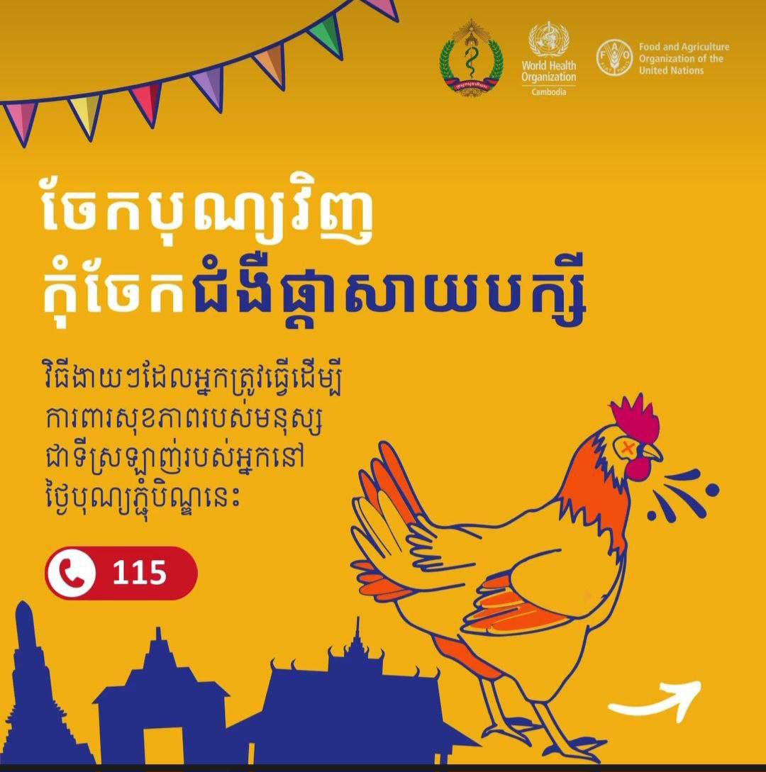 ជាមួយគ្នានេះ ប្រសិនបើបងប្អូនមានអាការៈគ្រុនក្តៅ ក្អក ឈឺបំពង់ក ឬពិបាកដកដង្ហើម ហើយមានប្រវត្តិប៉ះពាល់ជាមួយសត្វបក្សីឈឺ ឬងាប់ សូមរួសរាន់ទៅពិនិត្យសុខភាព និងពិគ្រោះយោបល់នៅមណ្ឌលសុខភាពឬមន្ទីរពេទ្យដែលនៅជិតបំផុត ដើម្បីទទួលបានការព្យាបាលទាន់ពេលវេលាឬទំនាក់ទំនងទៅលេខទូរស័ព្ទ១១៥ដើម្បីពិគ្រោះយោបល់បន្ថែម។