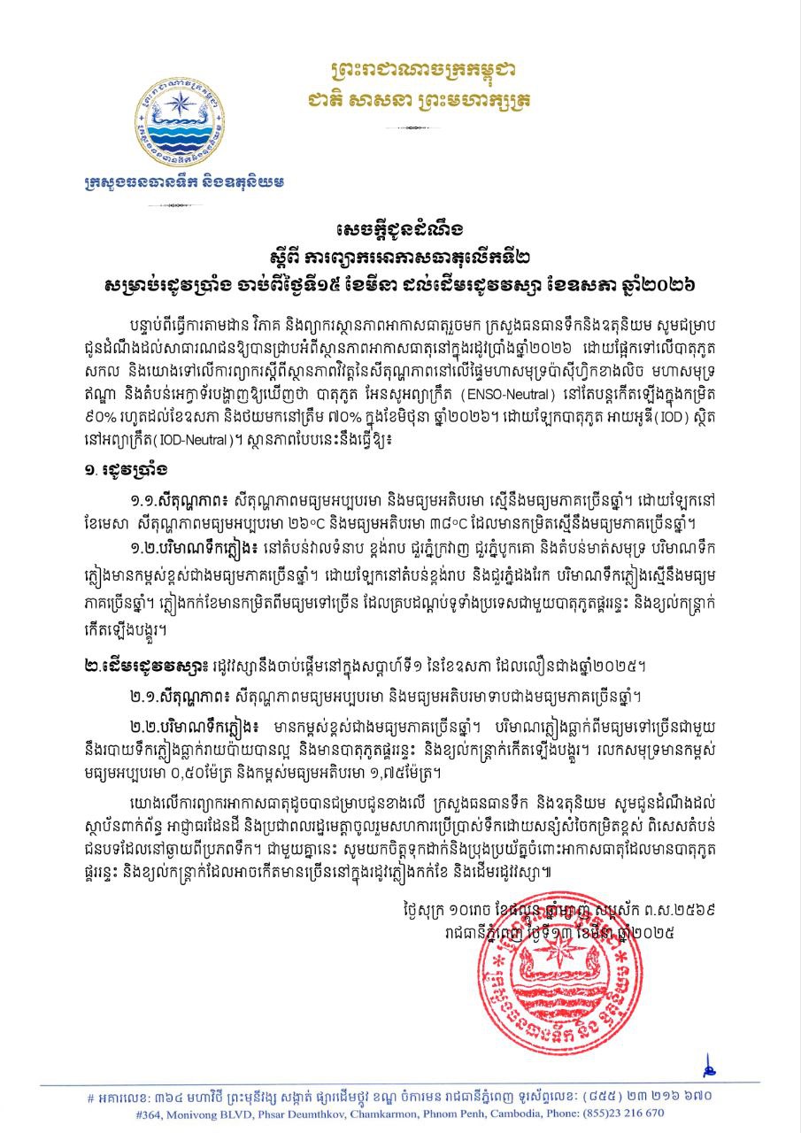 សេចក្តូជូនដំណឹង ស្ដីពីការព្យាករអាកាសធាតុលើកទី២ សម្រាប់រដូវប្រាំង ចាប់ពីថ្ងៃទី១៥ ខែមីនា ដល់ដើមរដូវវស្សា ខែឧសភាឆ្នាំ ២០២៦