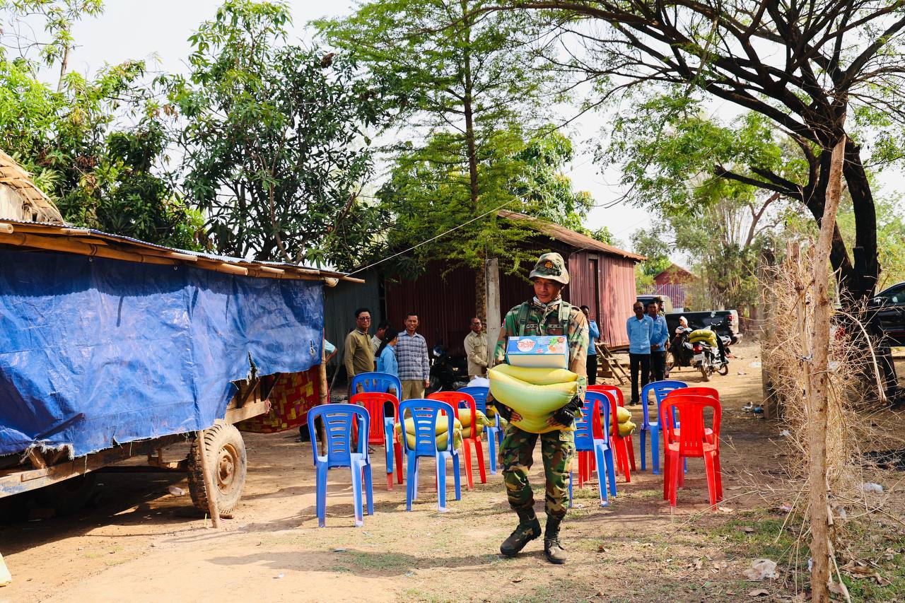 (កំពង់ធំ) ÷ លោកអភិបាលស្រុកស្ទោងលើកទឹកចិត្តអាជ្ញាធរមូលដ្ឋាននិងពលរដ្ឋត្រូវបន្តពហិកាទំនិញប្រទេសសៀម លោក សាយ គឹមឡម បានលើកទឹកចិត្តដូច្នេះក្នុងឱកាសដែលលោកអញ្ជើញចុះជួបសំណេះសំណាលសួរសុខទុក្ខនិងឧបត្ថម្ភស្បៀងដល់គ្រួសារកងទ័ព និងជនភៀសសឹកដែលកំពុងបន្តស្នាក់នៅក្នុងភូមិប្រាសាទ ឃុំចំណាលើស្រុកស្ទោងខេត្តកំពង់ធំ កាលពីព្រឹកថ្ងៃទី២៤ ខែមេសាឆ្នាំ ២០២៦។