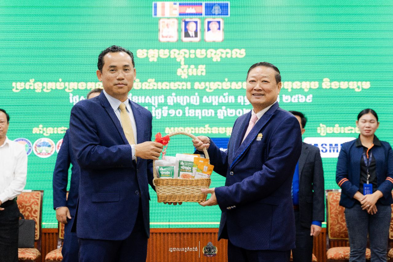 (កំពង់ធំ)៖ ឯកឧត្តម នួន ផារ័ត្ន អភិបាលនៃគណៈអភិបាលខេត្តកំពង់ធំ និងឧកញ៉ា តែ តាំងប៉ ប្រធានក្រុមប្រឹក្សាភិបាលសម្ព័ន្ធសមាគមសហគ្រាសធុនតូច និងមធ្យមកម្ពុជា និងជាប្រធានក្រុមប្រឹក្សាភិបាលសមាគមមូលនិធិសម្តេចតេជោ ដើម្បីអភិវឌ្ឍសហគ្រាសធុនតូច និងមធ្យមនៅកម្ពុជា បានអញ្ជើញជាអធិបតីក្នុងពិធីបើកសិក្ខាសាលាស្តីពី “ប្រព័ន្ធគ្រប់គ្រងគុណភាពចំណីអាហារសម្រាប់ សហគ្រាសធុនតូច និងមធ្យម” ក្នុងគោលបំណងអភិវឌ្ឍសហគ្រាសធុនតូច និងមធ្យម ផ្នែកចំណីអាហារ ឲ្យកាន់តែមានស្តង់ដារ និងមានការប្រកួតប្រជែងជាសកល នាព្រឹកថ្ងៃទី១០ ខែតុលា ឆ្នាំ២០២៥ នៅសាលប្រជុំប្រាសាទតោ។