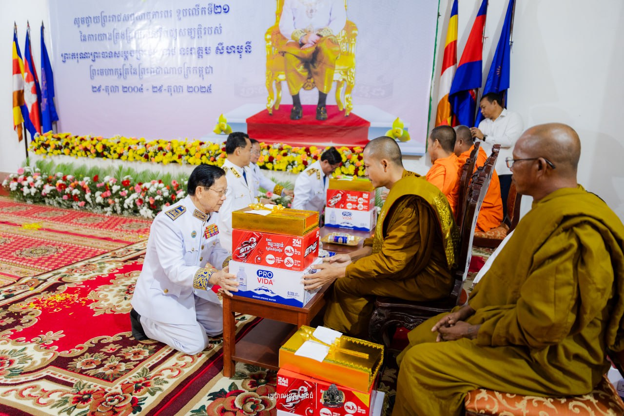 (កំពង់ធំ)÷ រដ្ឋបាលខេត្តកំពង់ធំ ប្រារពខួបលើកទី២១នៃការឡើងគ្រងព្រះបរមសិរី រាជសម្បត្តិ ព្រះករុណាព្រះបាទ សម្តេចព្រះបរមនាថ នរោត្តម សីហមុនី ព្រះមហាក្សត្រ នៃព្រះរាជាណាចក្រកម្ពុជា ក្រោមវត្តមានពីឯកឧត្តម ដៀប ពីរី ប្រធានក្រុមប្រឹក្សាខេត្ត ឯកឧត្តម នួន ផារ័ត្ន អភិបាលខេត្តកំពង់ធំ ឯកឧត្តមអភិបាលរងខេត្ត សមាជិកក្រុមប្រឹក្សាខេត្ត ព្រះសង្ឃ កងប្រដាប់អាវុធទាំងបី និងមន្ត្រីរាជការជាច្រើននាក់ផងដែរ នៅព្រឹកថ្ងៃទី២៩ ខែតុលា ឆ្នាំ ២០២៥ នៅសាលប្រជុំសាលាខេត្តកំពង់ធំ។