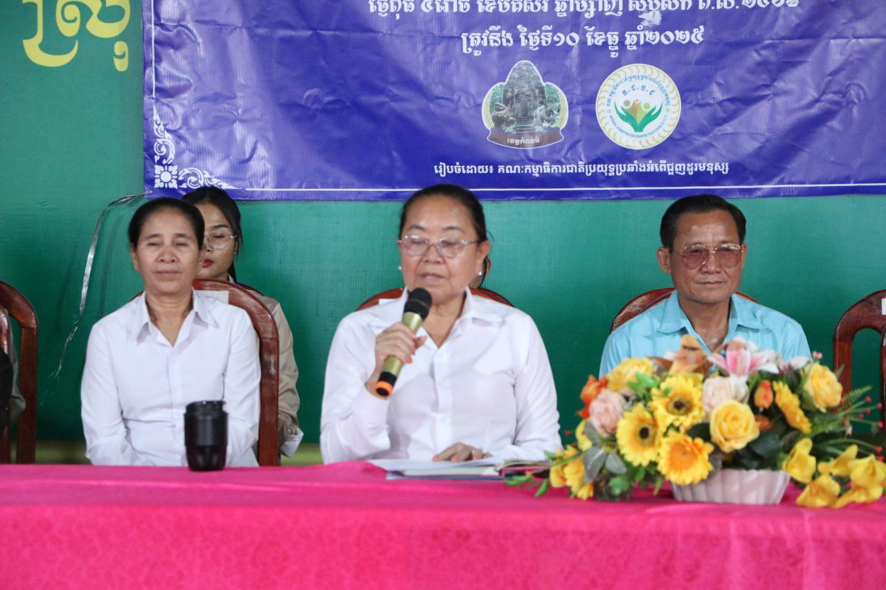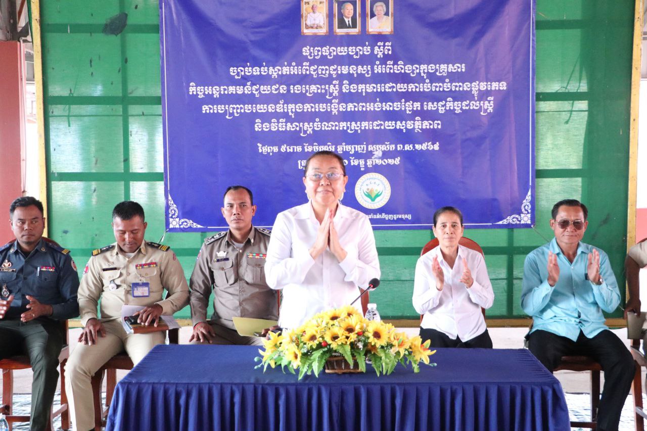 លោកជំទាវបានជំរុញលើកទឹកចិត្តដល់គណៈកម្មាធិការប្រយុទ្ធប្រឆាំងអំពើជួញដូរមនុស្ស ត្រូវយកចិត្តទុកដាក់ក្នុងការអនុវត្តតួនាទី/ភារកិច្ចរបស់ខ្លួនបានយ៉ាងល្អប្រសើរ ក្នុងការផ្សព្វផ្សាយដល់ ប្រជាពលរដ្ឋនៅតាមមូលដ្ឋាន រួមទាំងបានស្តារនីតិសម្បទាជនរងគ្រោះ និងបានជួយជនរងគ្រោះដែលត្រូវបានជនល្មើសកេងប្រវ័ញ្ចកម្លាំងពលកម្ម និងចាញ់បោកមេខ្យល់ខុសច្បាប់ទៅធ្វើការនៅក្រៅប្រទេស។ សូមឱ្យបងប្អូនប្រជាពលរដ្ឋទាំងអស់ យកចិត្តទុកដាក់ស្តាប់នូវការធ្វើបទបង្ហាញរបស់គ្រូឧទ្ទេស ព្រមទាំងទទួលយកចំណេះដឹងដើម្បីការពារខ្លួនឱ្យចៀសផុតពីការកេងប្រវ័ញ្ច របស់ជនខិលខូចគ្រប់រូបភាព។