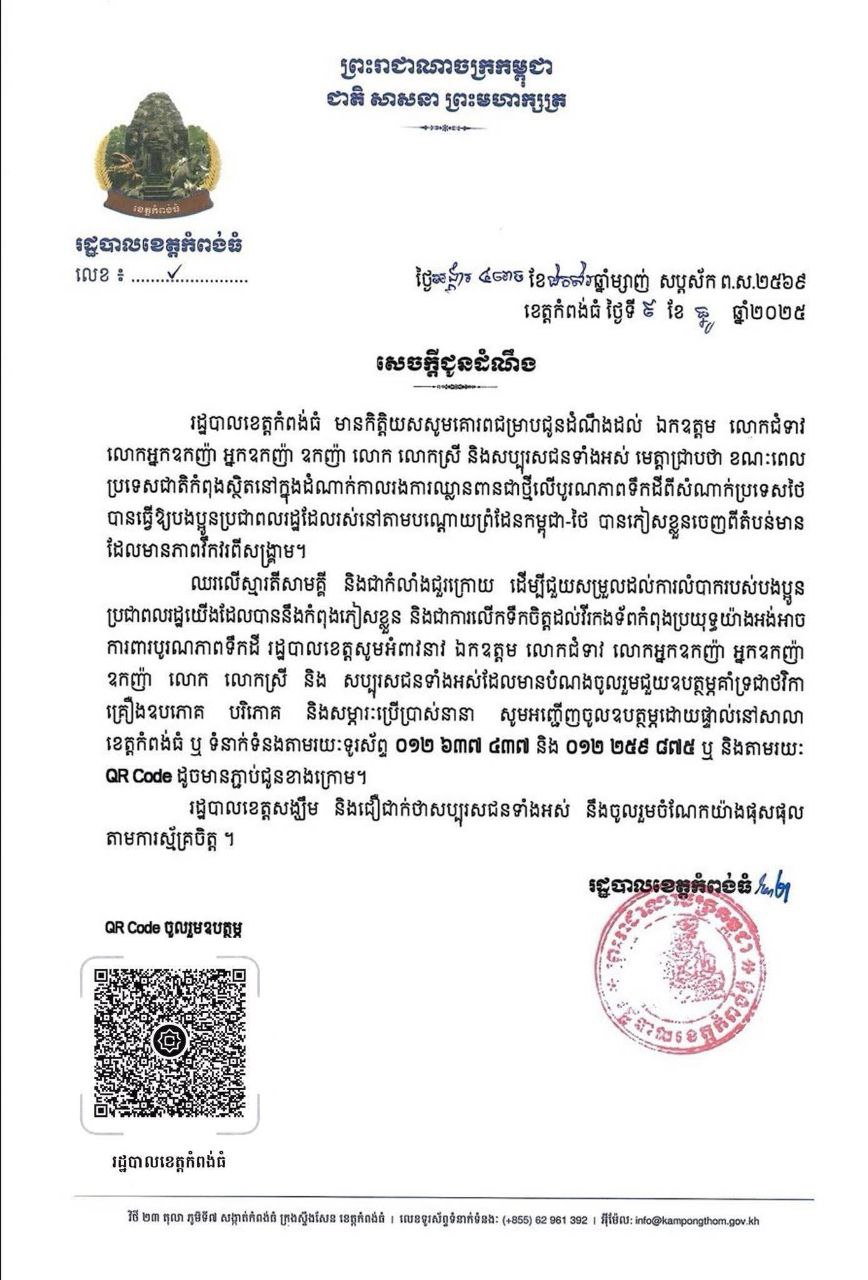 (កំពង់ធំ)÷ ក្រោយពីរដ្ឋបាលខេត្តកំពង់ធំ ចេញសេចក្តីអំពាវនាវកាលពីថ្ងៃទី០៩ ខែធ្នូ ២០២៥ ស្តីពីការជួយគាំទ្រពលរដ្ឋដែលកំពុងភៀសខ្លួនពីតំបន់សង្គ្រាមនៅព្រំដែន និងជាការលើកទឹកចិត្តដល់វីរៈកងទ័ពជួរមុខរួចមក សង្កេតឃើញមានបងប្អូនប្រជាពលរដ្ឋ និងសប្បុរសជនជាច្រើនបានឆ្លើយតបយ៉ាងផុសផុលគិតដល់រសៀលនៅថ្ងៃទី១២ ខែធ្នូ ២០២៥។