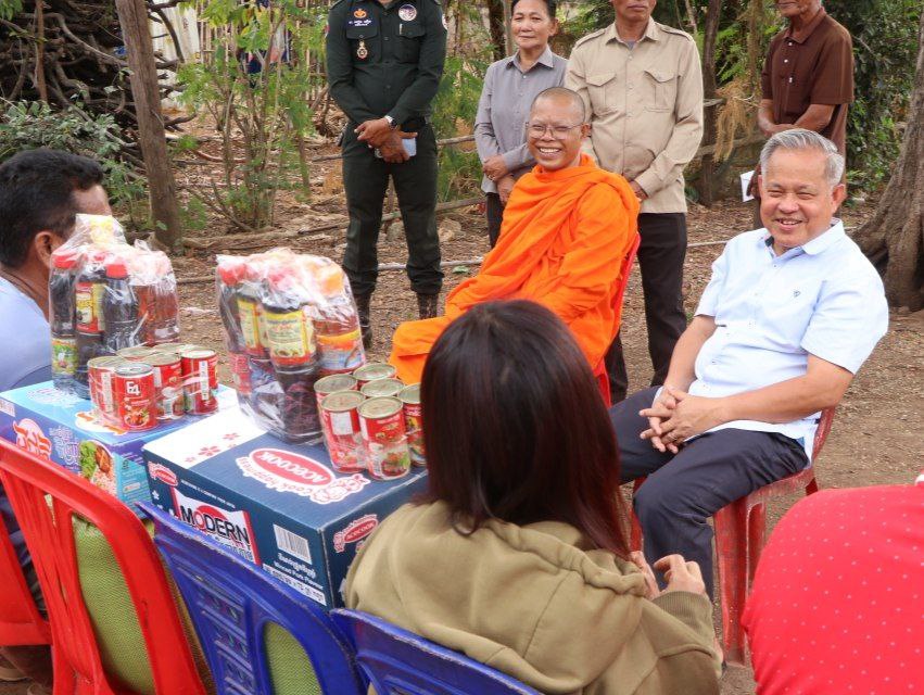 (កំពង់ធំ)៖ លោក ហាក់ ម៉ុងហួត អភិបាលស្រុកតាំងគោក និងព្រះគ្រូ តុន ពិសី ព្រះចៅអធិការវត្តគុហានគរ ព្រមទាំងថ្នាក់ដឹកនាំ និងមន្ត្រីរាជការនៃរដ្ឋបាលស្រុក នាថ្ងៃទី២៦ ខែធ្នូ ឆ្នាំ២០២៥នេះ បានបន្តចុះជួបសំណេះសំណាល និងនាំយកអំណោយមនុស្សធម៌ ចែកជូនគ្រួសារកងទ័ព កងរាជអាវុធហត្ថ នគរបាល ដែលនិងកំពុងបំពេញភារកិច្ចនៅជួរមុខ ចំនួន១៨គ្រួសារ ដែលបានជម្លៀសខ្លួនចេញពីតំបន់សមរភូមិប្រយុទ្ធនៅព្រំដែន មកកាន់ទីតាំងសុវត្ថិភាពនៅនៅឃុំពង្រ  ក្នុងស្រុកតាំងគោក ខេត្តកំពង់ធំ។