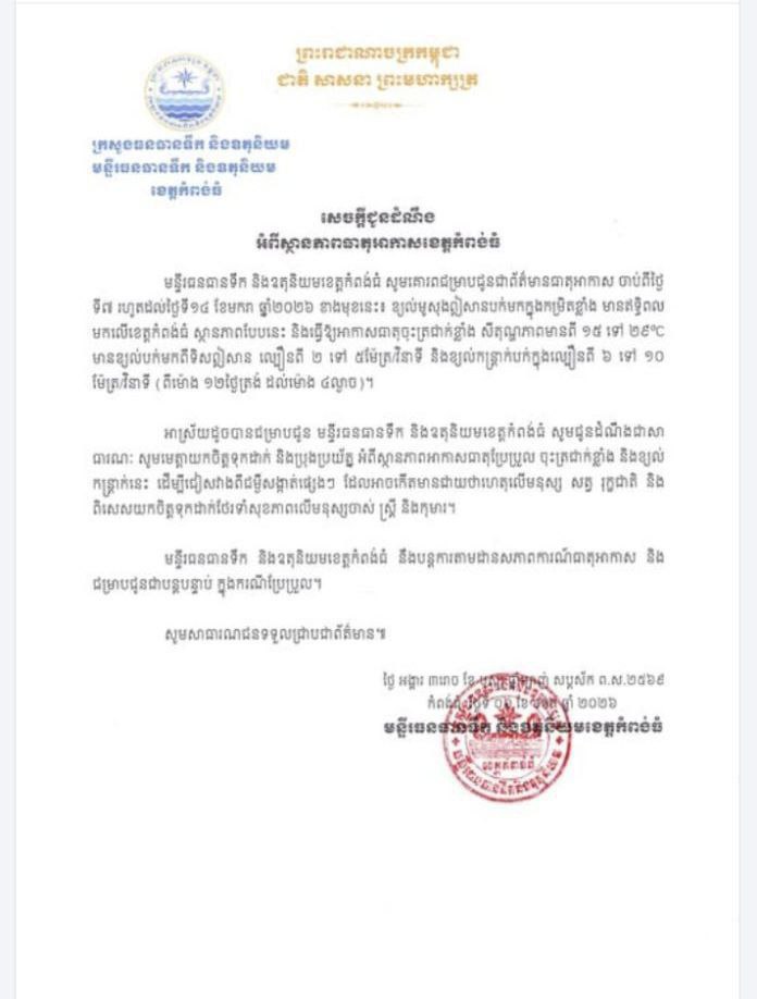 សេចក្តីជូនដំណឹង អំពីស្ថានភាពធាតុអាកាសខេត្តកំពង់ធំ មន្ទីរព័ត៌មាន ខេត្តកំពង់ធំ ទទកធ-KNTV — January 6, 2026 12:09 pm · 0 Comment សេចក្តីជូនដំណឹង អំពីស្ថានភាពធាតុអាកាសខេត្តកំពង់ធំ Subscribe ទទកធ-KNTV